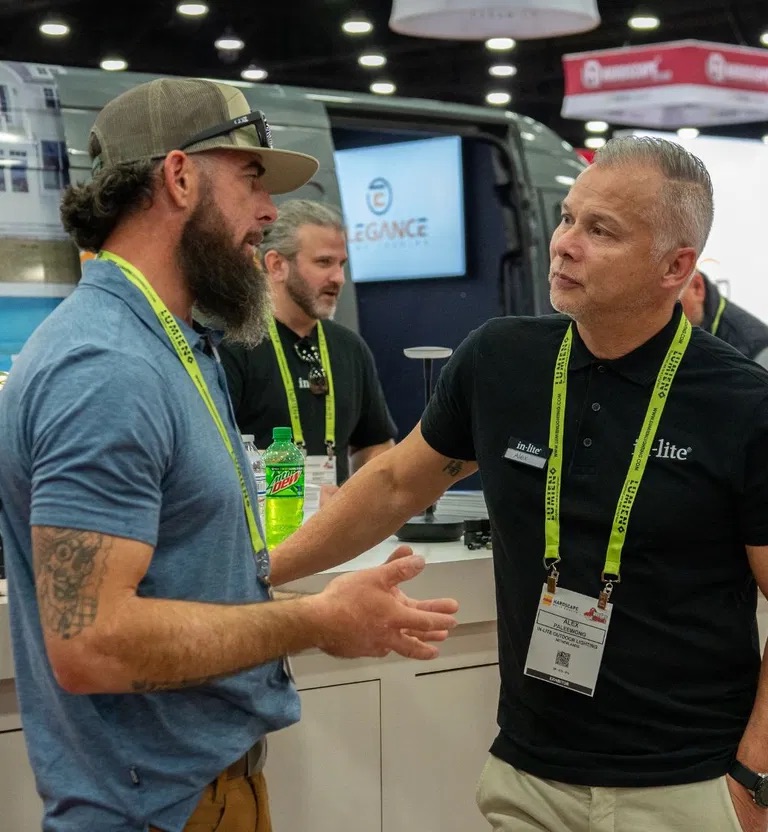 Pavers, stone, decking, outdoor kitchens, lighting, and irrigation shown in full-scale vignettes that contractors and homeowners can walk through.